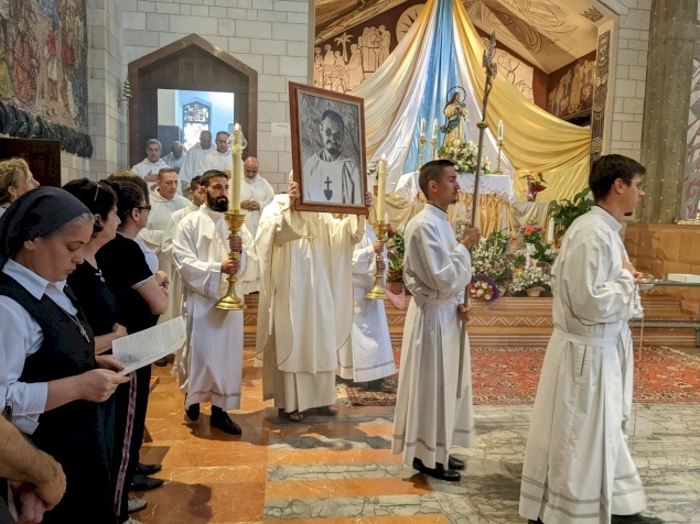 Que la Virgen María, Quien aquí en este Lugar Santo custodió la vida escondida de Jesús, interceda por todos nosotros, para que, siguiendo el ejemplo de CdF, también nosotros aprendamos, cada día más, a custodiar el amor que sostiene nuestra Iglesia de Tierra Santa. Amén.