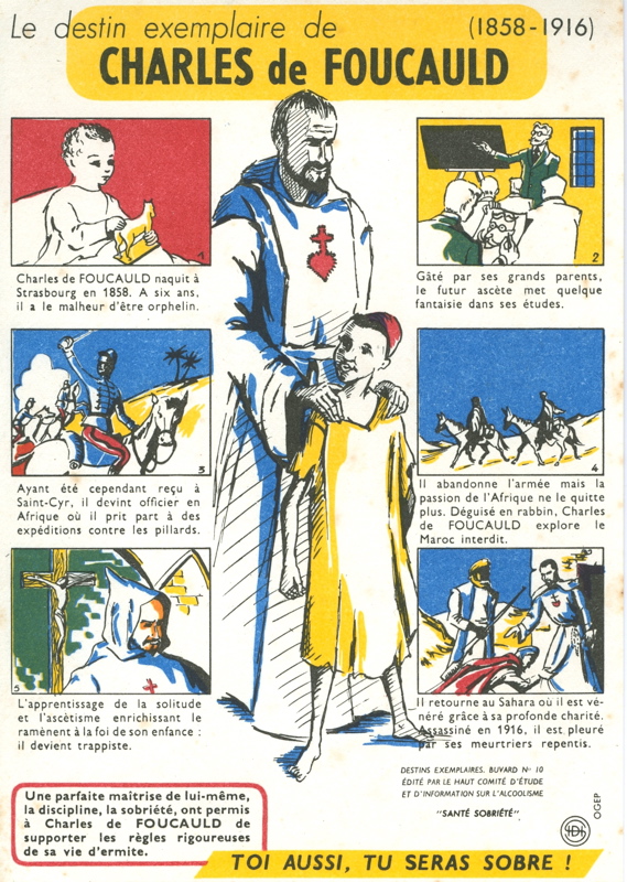 reconocimiento en Marruecos., que se publicó en 1888. Fue ordenado sacerdote el 9 de junio de 1901, 17 años después de un viaje a Marruecos que no fue más que un simple viaje de estudio y exploración.En París, no hay cama en su apartamento. Charles de Foucauld duerme sobre una alfombra, envuelto en un albornoz. Su alma anhela encontrar a Dios. A menudo entra a las iglesias y un día dice esta oración: “Dios mío, si existes, déjame conocerte”. A finales de octubre de 1886, en la iglesia de San Agustín, se confesó y recibió la Sagrada Comunión de manos del padre Huvelin. Dos años más tarde, tras la publicación de su libro sobre su viaje a Marruecos, partió en peregrinación a Tierra Santa. De regreso a Francia, entró en la Trappe de Notre-Dame-des-Neiges en enero de 1890 y tomó el nombre de Hermano Marie-Albéric. Durante el verano siguiente, partió hacia Trappe d’Akbès en Siria.Después de dimitir en 1890 de la Société de Géographie, el hermano Marie-Albéric renunció también a su rango de oficial de reserva. En 1892 hizo sus votos y recibió la tonsura. Ocho meses después, formuló por primera vez la idea de una nueva congregación de monjes que vivieran únicamente del trabajo de sus manos y llevaran eficazmente la vida de Nuestro Señor en Nazaret. En 1896, Charles de Foucauld escribió su primer proyecto para una congregación religiosa. Luego lo enviaron a Roma, donde se suponía que estudiaría durante tres años. Después de tres meses, el Reverendo Padre General le concedió la dispensa de sus votos y le dejó libre para seguir la vocación particular que le parecía suya. En febrero de 1897, hizo los dos votos de castidad perpetua y pobreza y luego se embarcó hacia Tierra Santa. En 1900, El hermano Marie-Albéric quiere comprar el Monte de las Bienaventuranzas para instalarse allí como sacerdote ermitaño. Al no llegar a buen término el proyecto, regresó a Francia y decidió prepararse para el sacerdocio.El 9 de junio de 1901 fue ordenado sacerdote en el Seminario Mayor de Viviers. Se le autoriza entonces a vivir solo o con otras personas en la diócesis del Sahara. Eligió establecerse en el sur de Orania, cerca de la frontera marroquí, con el objetivo de preparar la evangelización de Marruecos. El 20 de octubre de 1901, el hermano Carlos de Jesús celebró por primera vez misa en Béni-Abbès y compró un terreno en el que construyó una fraternidad. El 9 de enero de 1902 compró su primer esclavo al que llamó Joseph du Sacré-Cœur. Al año siguiente, el padre de Foucauld pensó en viajar a Marruecos y fundar allí una fraternidad. Le gustaría tener compañeros a los que pediría tres cosas: «