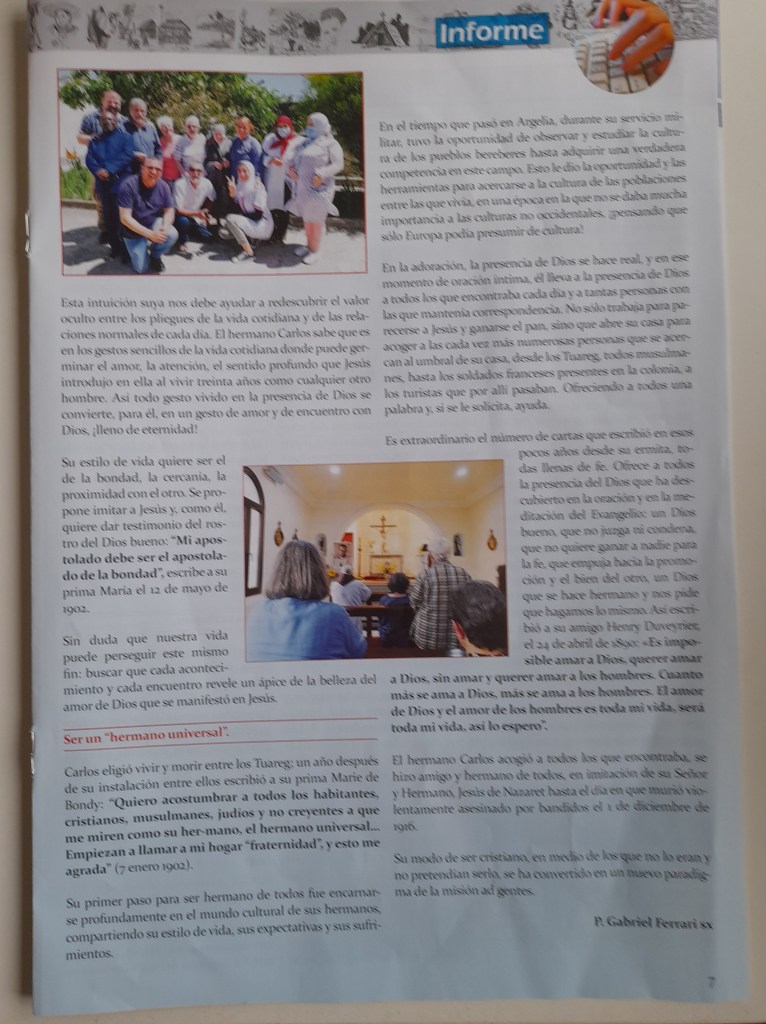 Esperamos la canonización del beato Carlos de Foucauld con el sueño de impulsar la fraternidad universal y, más en concreto, el diálogo cristiano-musulmán. «La Iglesia es una casa con las puertas abiertas, porque es madre» (FT 269).